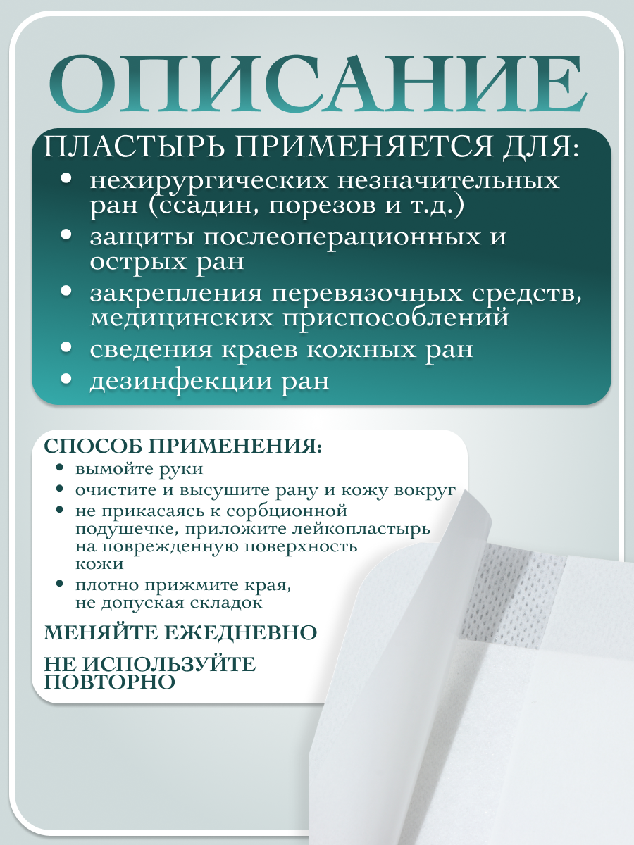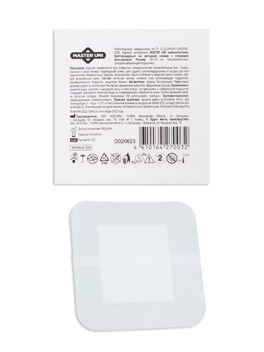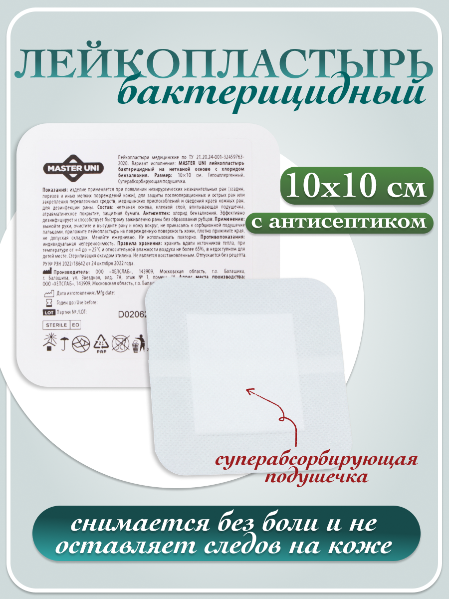 Набор бактерицидных лейкопластырей Master Uni размером 10х10 см. Каждый лейкопластырь обладает бактерицидной пропиткой на основе хлорида бензалкония, что обеспечивает надежную защиту от микробов и способствует быстрому заживлению ран.