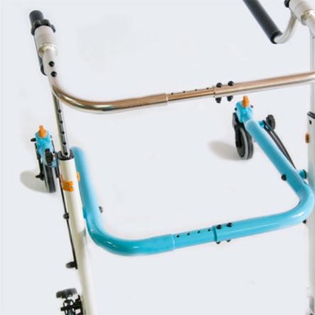 Детский спортивный инвентарь-тренажер с алюминиевой рамой имеет складную конструкцию. Спортивный инвентарь-тренажер оснащён съёмными подлокотными опорами и ручками с регулировкой положения. Модель детского тренажёра регулируется по высоте и ширине.