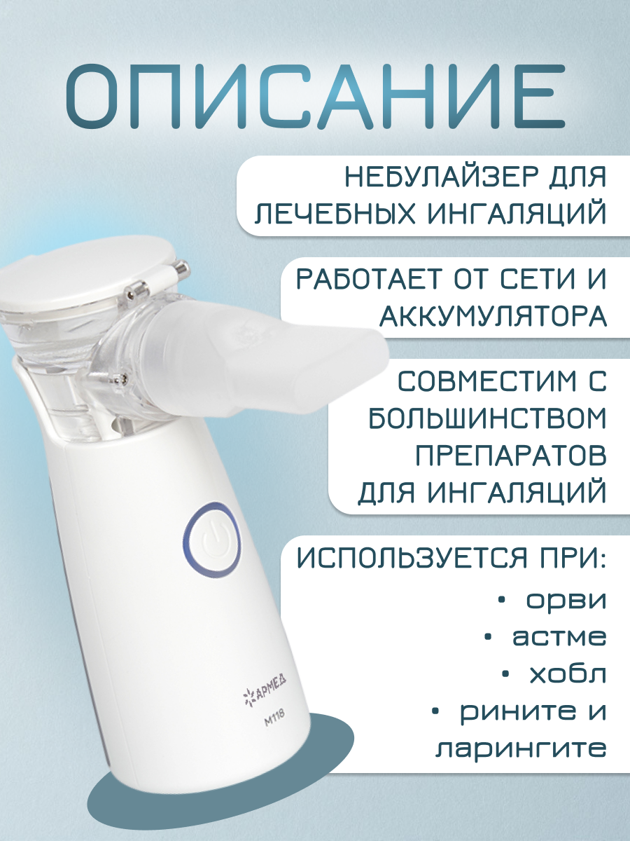 Портативный прибор для всей семьи, позволяющий проводить лечебные ингаляции где и когда удобно. Благодаря невероятно компактным размерам и независимости от электросети небулайзер можно использовать даже на улице. Он не требует сложной подготовки к процедуре и совместим с большинством препаратов для ингаляций, а тихая и быстрая работа делает прибор идеальным для лечения детей.