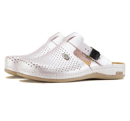 Женские тапочки-сабо созданы из натуральной кожи и оснащены полиуретановой подошвой, которая создаёт свободу движения при использовании обуви. Благодаря натуральному материалу и специальным отверстиям для вентиляции, модель не задерживает влагу, сохраняя комфорт и сухость при ношении. Перераспределение нагрузки тапочек-сабо способствует снижению нагрузки на позвоночник и суставы.