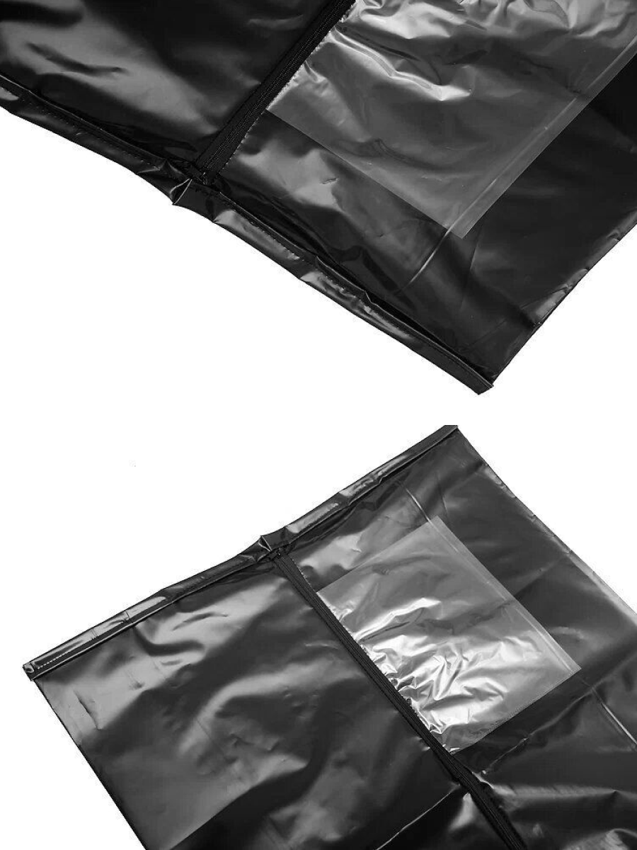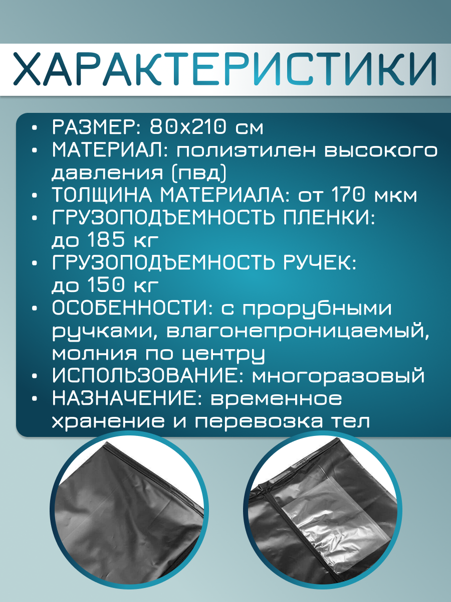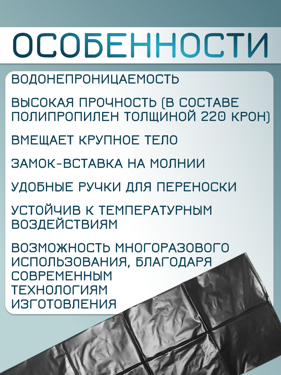 Патологоанатомический мешок с ручками и с замком типа “молния” по центру. Мешок изготовлен из прочного полиэтилена высоко давления.