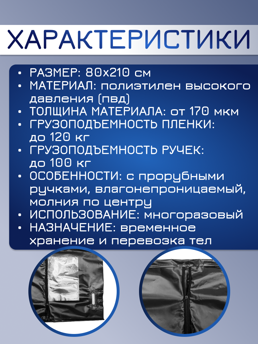 Патологоанатомический мешок с ручками и молнией по центру. Размер патологоанатомического мешка 80*210 см. Мешки патологоанатомические (для трупов) изготовлены из ламинированного спанбонда плотностью 85г/м3.