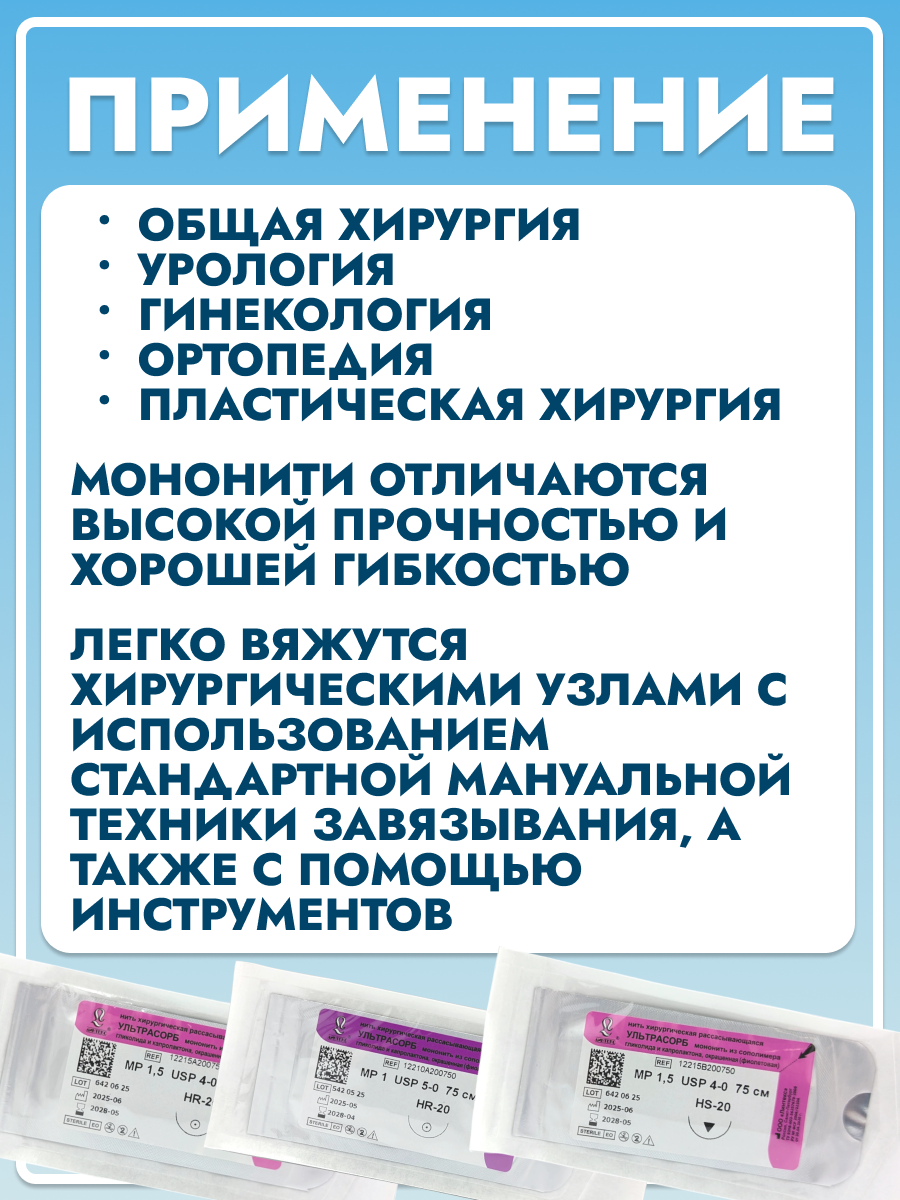 Мононити УЛЬТРАСОРБ идеально подходят для операций на мочевыделительной и желчевыделительной системах, а также в общей хирургии, урологии, гинекологии, ортопедии и пластической хирургии.