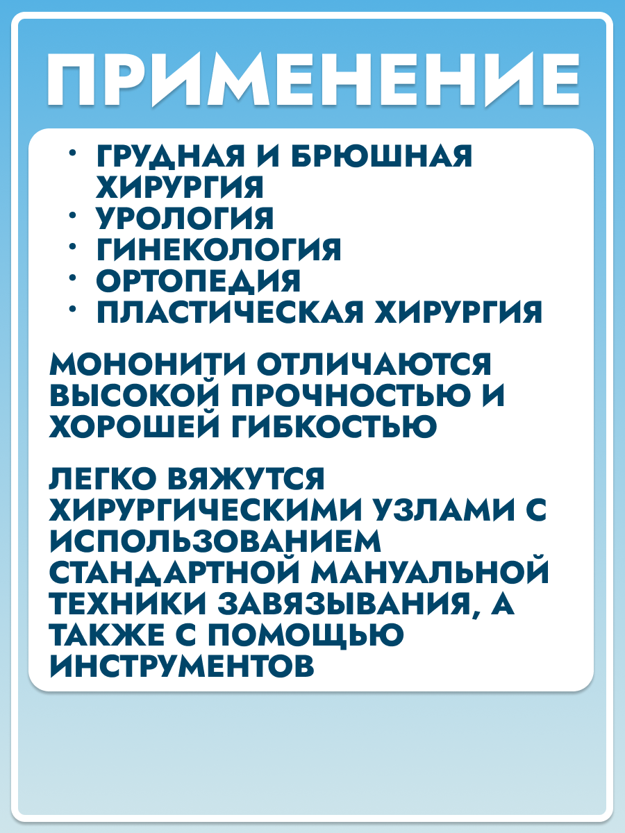Нити МОНОСОРБ используют для ушивания апоневрозов в грудной и брюшной хирургии, урологии, гинекологии, ортопедии и пластической хирургии.
